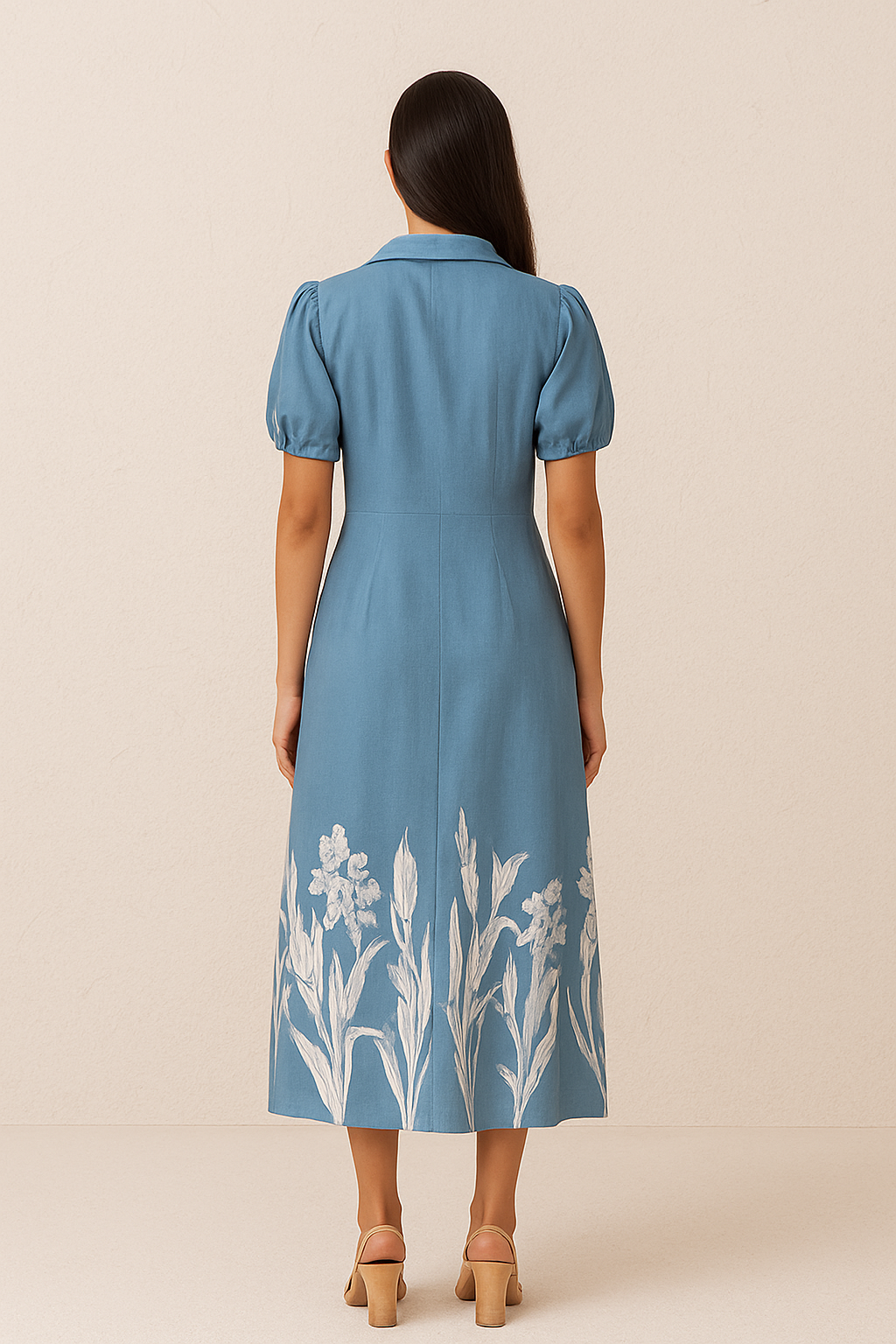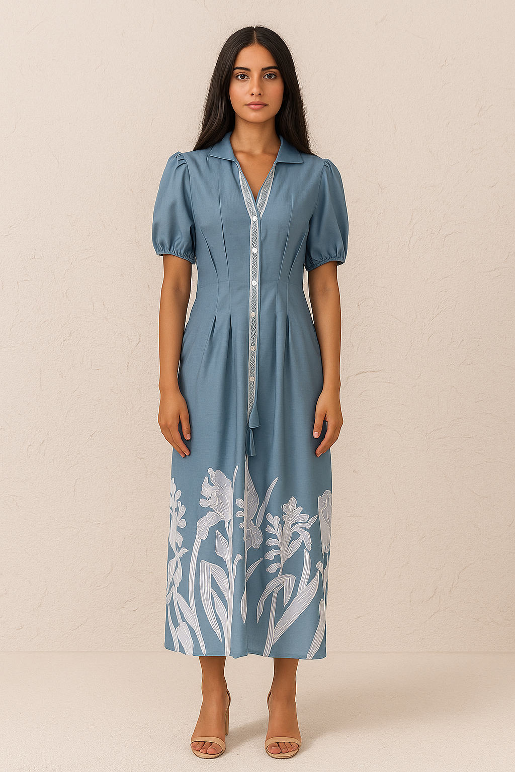 This full-length cotton dress, named Iris, features delicate machine embroidery of iris flowers that adds refined detail and texture. The puffed sleeves enhance its elegant silhouette, offering a timeless and graceful look. Crafted from breathable cotton, it ensures comfort throughout wear, making it ideal for both casual and semi-formal occasions.